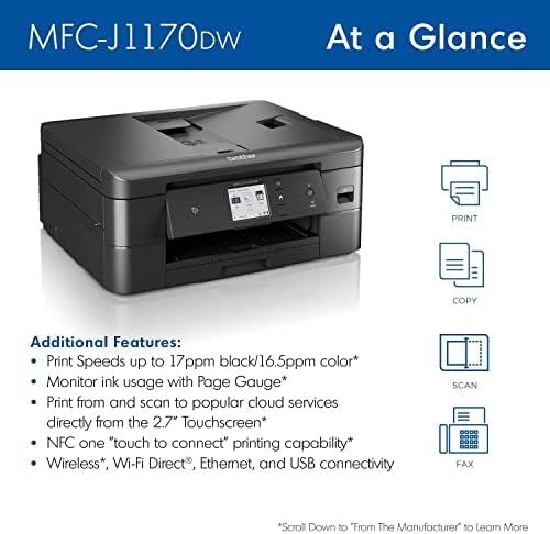 Written to deliver quick and easy prints, Brooklyn based manufacturer Brother brings you the MFC-J1170DW – the wireless color inkjet all-in-one printer which is also equipped with mobile device printing, NFC, cloud printing & scanning.
