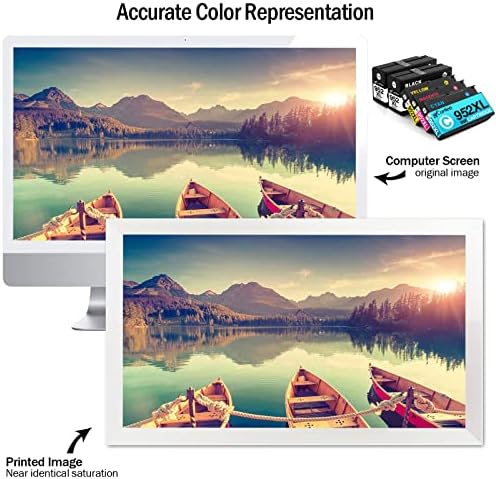 The pack contains five compatible cartridges for HP 952XL (two black, one cyan, one magenta, and one yellow). Each black cartridge has a page yield of up to 2200 pages, while each color cartridge can print up to 1800 pages. All cartridges come filled with a new generation chip, work with all new printers, and display ink levels. They are ISO9001 certified for cartridge quality and reliability and ISO 14001 certified for environmental impact.