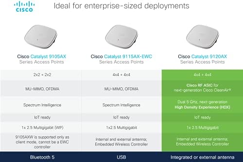 The Cisco Catalyst 9120AXI-EWC-B Wireless Access Point is the perfect solution for mission-critical wireless networking deployments in high-density environments with its dual 5-GHz frequency bands and integrated IoT radio. This access point also features advanced CleanAir technology powered by the reliable Cisco RF ASIC module that offers exceptional wireless analytics and security beyond the Wi-Fi 6 (802.11ax) standard.