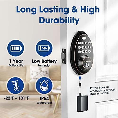 ELAMOR Keyless Entry Door Lock is a smart deadbolt that offers secure and convenient access to your home. This electronic door lock has a keypad with illuminated buttons, allowing you to easily enter your code even in low light conditions. With the capability to store up to 50 different user codes, you can easily grant access to family, friends, or renters.
