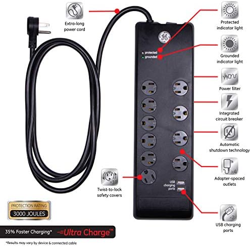 Keep your devices safe and charged with the GE UltraPro 10-Outlet Surge Protector that includes 2 USB ports, a 6-foot power cord, 3000 joules of protection, a flat plug, twist-to-close safety covers, power filter, circuit breaker, warranty, and UL Listed black design.