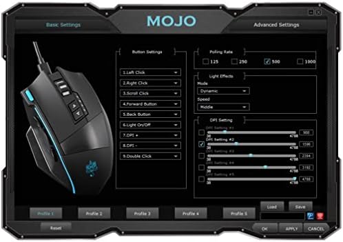 The MOJO gaming mouse comes with custom gaming software that allows you to set up gamer profiles, macros, and adjust DPI refresh rate and other settings. The mouse has a flawless advanced gaming sensor PMW3212, and the DPI can be adjusted between 1000-1600-2400-3200-4800. The polling rate is 125-250-500-1000 Hz.