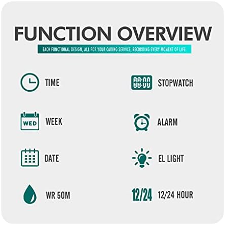 MULTI-FUNCTION SET: The watch is equipped with a calendar, week display, alarm, 1/100 second stopwatch, LED backlight, and 50M waterproof. It allows you to quickly switch between 12H and 24H time modes.