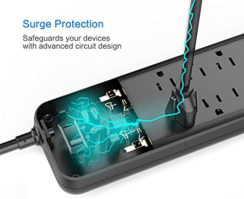 γSurge Protection & Overload Protectionγ The surge protector with USB features 900J surge protection rating, which will safeguard your electronic devices from overload, short circuits, voltage fluctuations, etc. With an integrated circuit breaker, the power ON/OFF switch will trip off automatically in the event of power overload.