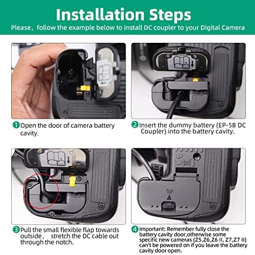 The RONFEN EP-5B DC Coupler Power Connector Kit is compatible with Digital cameras Nikon Z5 Z6 Z6 II Z7 Z7 II D500 D600 D610 D750 D780 D800 D800A D800E D810 D810A D850 D7000 D7100 D7200 D7500 and 1 V1.
