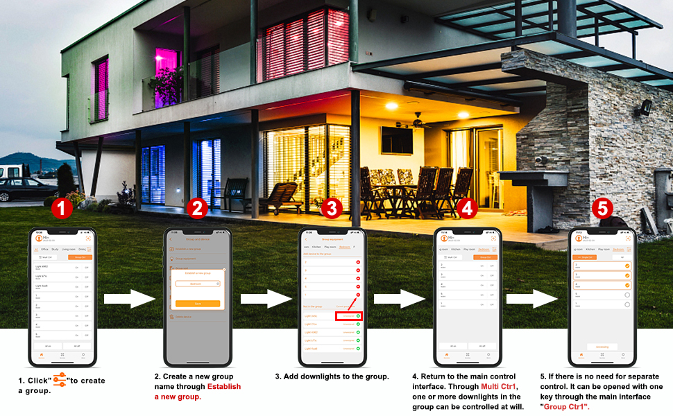 Create a group on the app and control the lighting effect in the specific room. You can also share devices and control smart downlights with family members. This lets you enjoy life together.