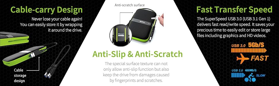 The hard drive has a military-grade shockproof rating, and it is also IPX4 water-resistant, offering excellent protection for your data against accidental drops and splashes. Additionally, it features a cable-carry design which allows for easy cable storage, ensuring you always have your cables with you when you need them.