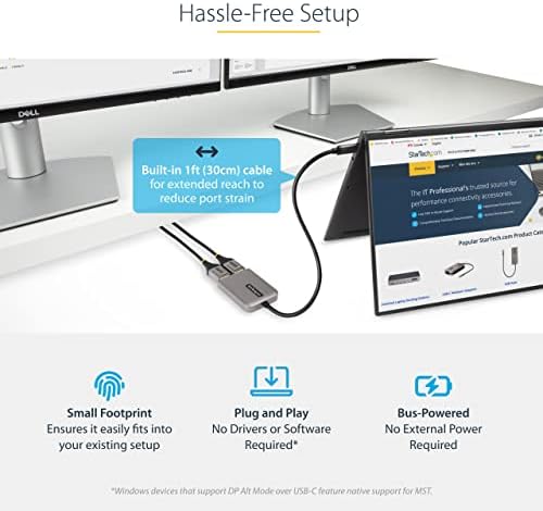 The StarTech.com 2-Port USB-C MST Hub supports dual-4K 60Hz monitors and other supported display configurations are available on the resolution chart. It features a 1ft (30 cm) built-in extra-long cable for extended reach and reduces port/connector strain on 2-in-1 devices such as Surface Pro 7/8, iPad Pro, HP Elite x2, and laptops on riser stands. You can download our App with Windows Layout Utility for hassle-free connectivity.