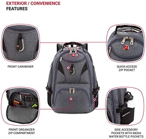 The SwissGear 5977 ScanSmart Laptop Backpack is also spacious and organized, with an electronics-only compartment, a large capacity main compartment, side zip accessory pockets, water bottle pockets, front organizer compartments, and a top quick access pocket for storing smaller items. The backpack is ergonomically contoured, and the padded shoulder straps are made of mesh fabric with built-in suspension. The padded back panel is equipped with Airflow ventilation technology to provide maximum support and comfort.